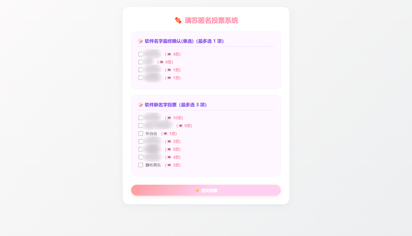 匿名用户访问,支持多问题同时投票、限制多选数量,自动记录 IP 和投票记录: